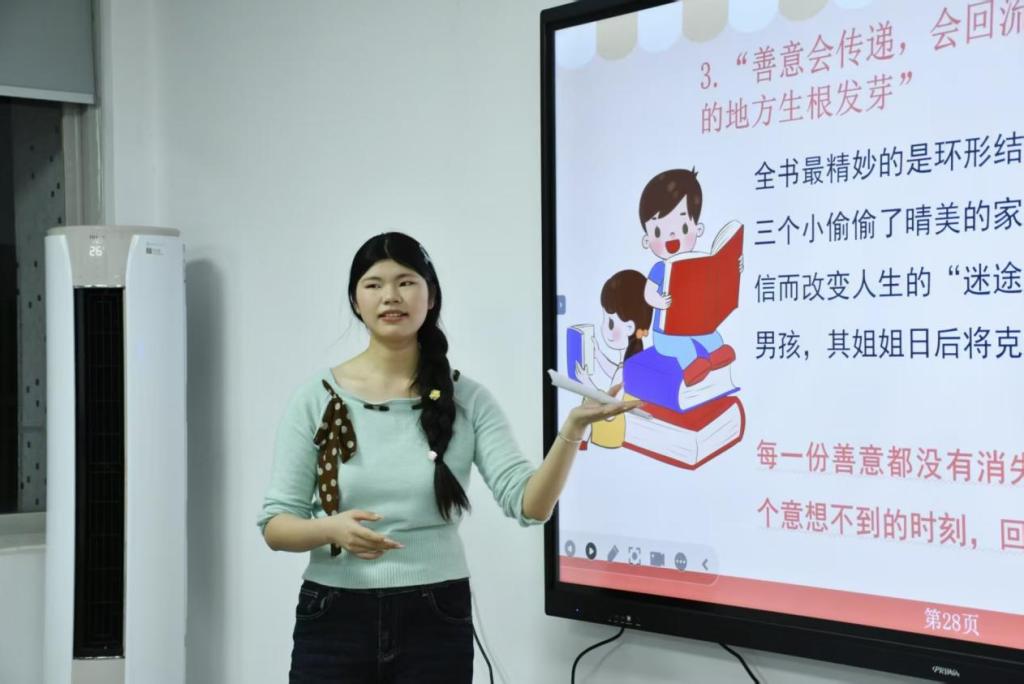 随后,刘巧灵从作者简介、内容梗概、主题探究、阅读感悟及问题延伸五个方面依次展开。她以三个小偷误入杂货店、跨越时空回复咨询信为主线,展示了运动员月兔、音乐人克郎、未婚母亲绿河、少年浩介及职场新人晴美等角色在人生岔路口的挣扎与抉择。以此揭示共同主题:人生没有绝对正确的选项,关键在于选择后能否全力以赴,无悔前行。