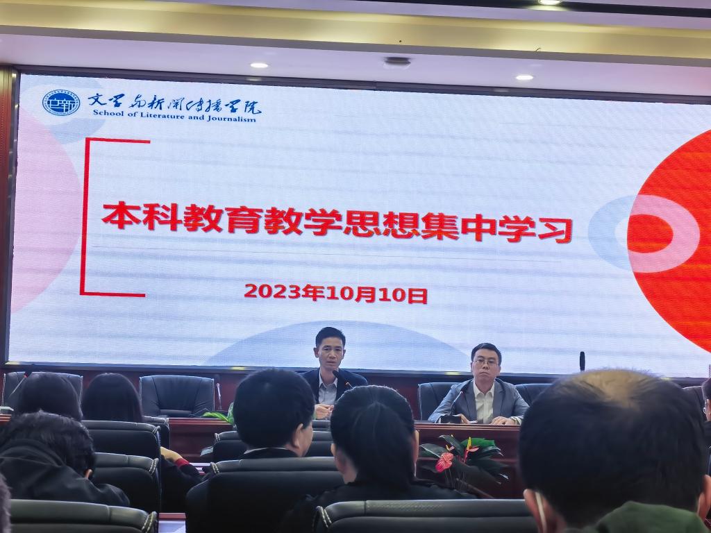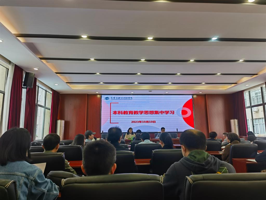 为凝心聚力,高质量做好新一轮本科教育教学审核评估工作,2023年10月10日下午两点半,学院在9教218会议室开展本科教育教学思想集中学习,并就第2期教学质量月活动进行了部署。院长刘建新、教学副院长(挂职)戴钰发言,院党委副书记(主持工作)陈仁凯主持会议,其他院领导与全体老师共同参与。