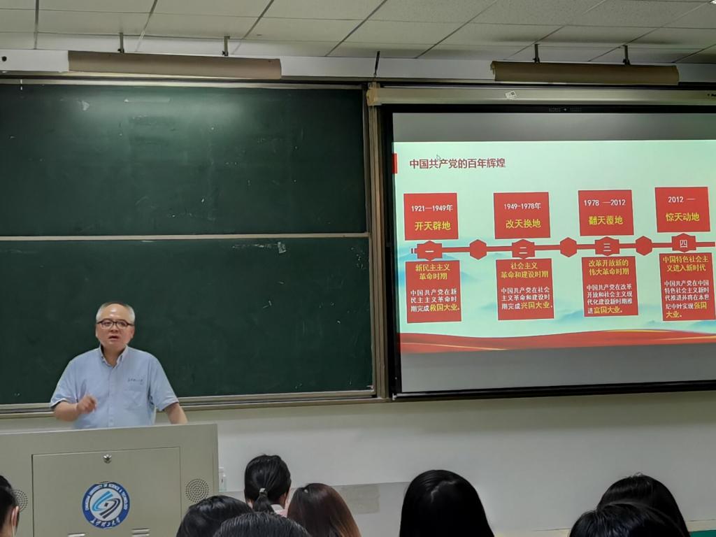 邓豫在课堂中首先以问题为前言,其次指出党的百年历程是沧桑而辉煌的并始终以实现中华民族伟大复兴为目标。他通过“摆事实讲道理”的授课方式,以中国共产党在百年中经历的历史大事体现中国共产党遇挫折而不退缩,不断进步的品质。