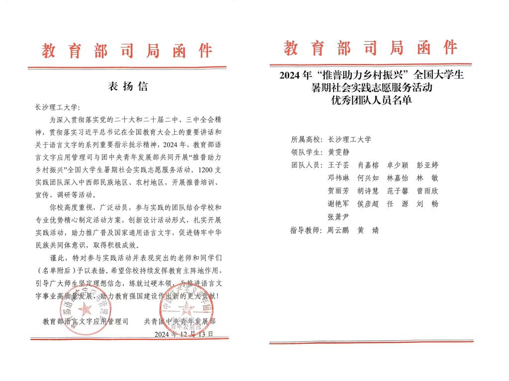 近日,由教育部语言文字应用管理司、共青团中央青年发展部联合开展的2024年“推普助力乡村振兴”全国大学生暑期社会实践志愿服务活动评选结果揭晓,由文新学院组织赴湖南省邵阳市新宁县的“‘语润坪山’在线买世界杯平台赴新宁县推普助力乡村振兴”服务队从全国1200支团队中脱颖而出,获评优秀团队,教育部语言文字应用管理司和共青团中央青年发展部来信表扬。