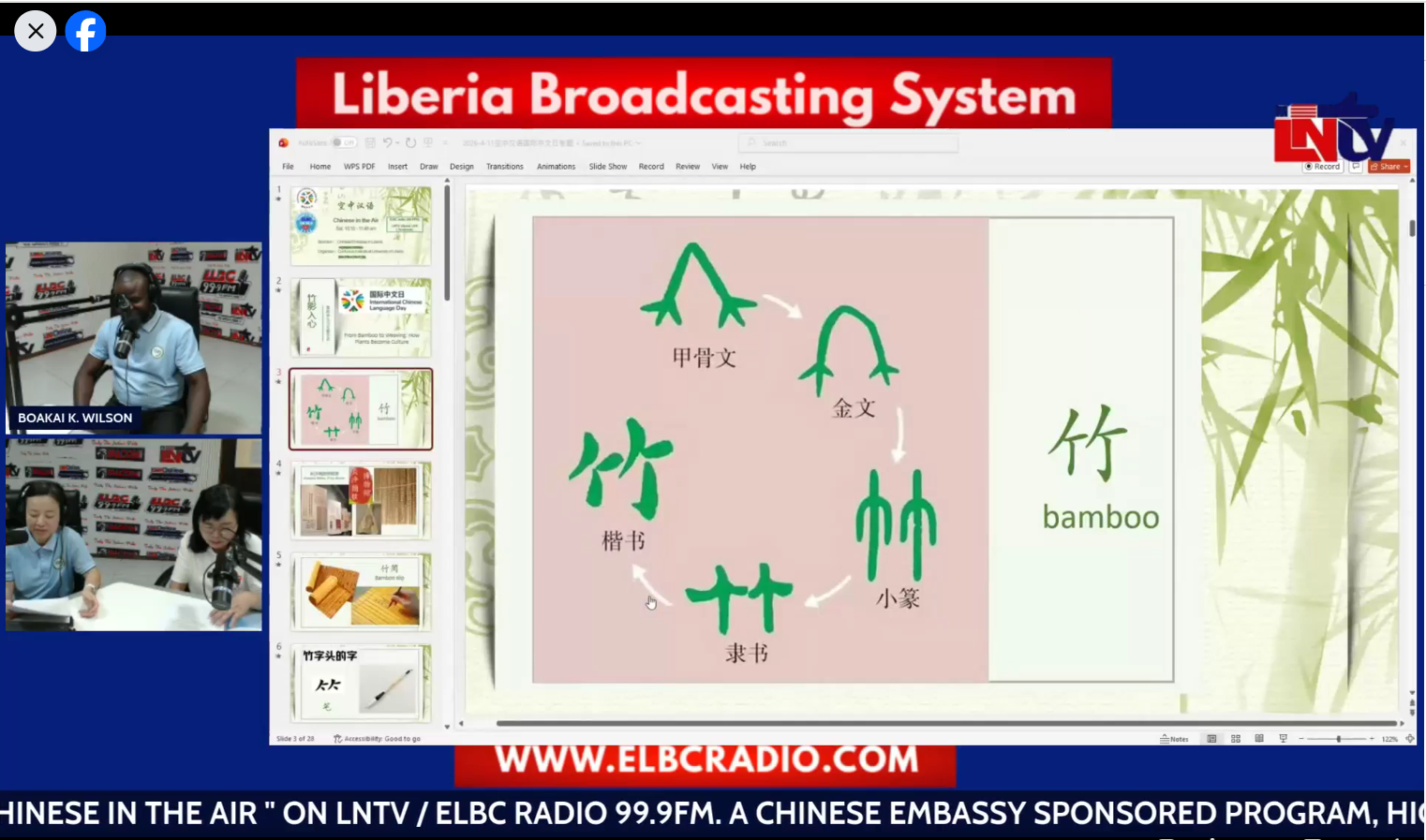 2026411日,在国际中文日到来之际,利比里亚大学孔子学院联合中国援利竹藤编项目组,以“竹影入心”为主题在利比里亚国家广播电台播出《空中汉语》特别节目,电台官方平台以Facebook方式同步直播。