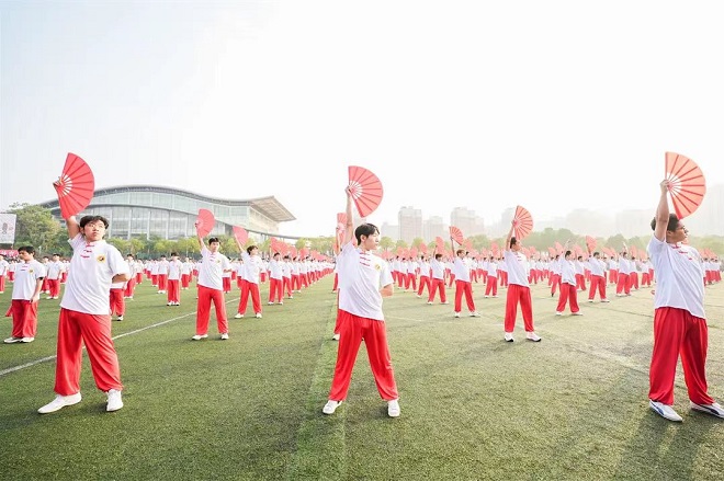 团体操的外语人们场上的他们肆意地绽放青春的色彩。