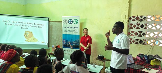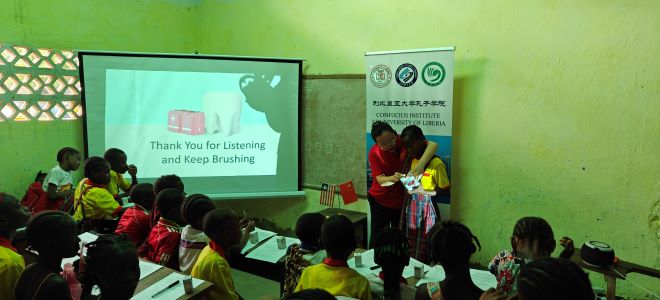 2024年5月24日,在六一儿童节即将来临之际,利比里亚大学孔子学院携手第16批援利医疗队,在利比里亚大学孔子学院教学点中利友谊学校共同举办了一场口腔卫生健康讲座,并随后为该教学点全体教职工进行了义诊。利大孔院教师、医疗队全体队员及中利友谊学校全体师生一百余人参加活动。