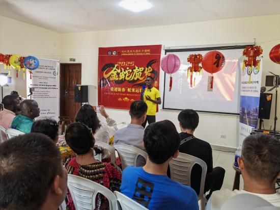 当地时间2025年1月25日,利比里亚大学孔子学院在中方教师驻地举办了一场热闹非凡的春节联欢会。此次联欢会吸引了援利医疗队、在利中资企业代表、孔院教学点负责人、众多师生、以及利国中文爱好者们的热情参与,近百人欢聚一堂,共庆2025中国农历新年的到来。利比里亚多家知名电视、广播及主流网络媒体对本次春节联欢会进行了全程直播及新闻报道。