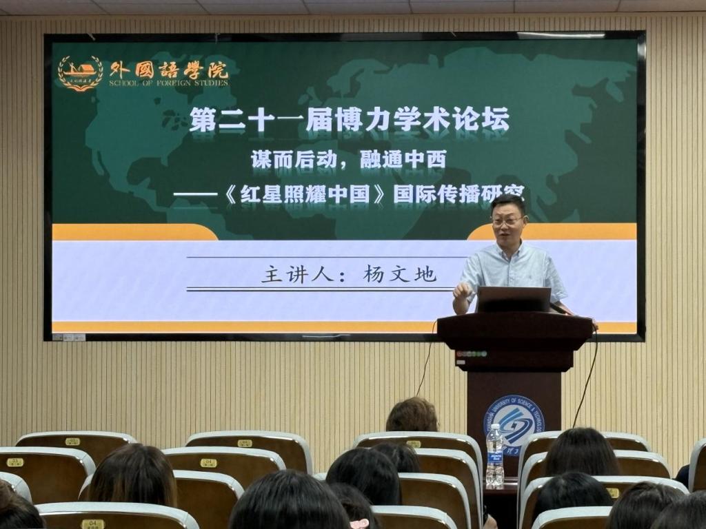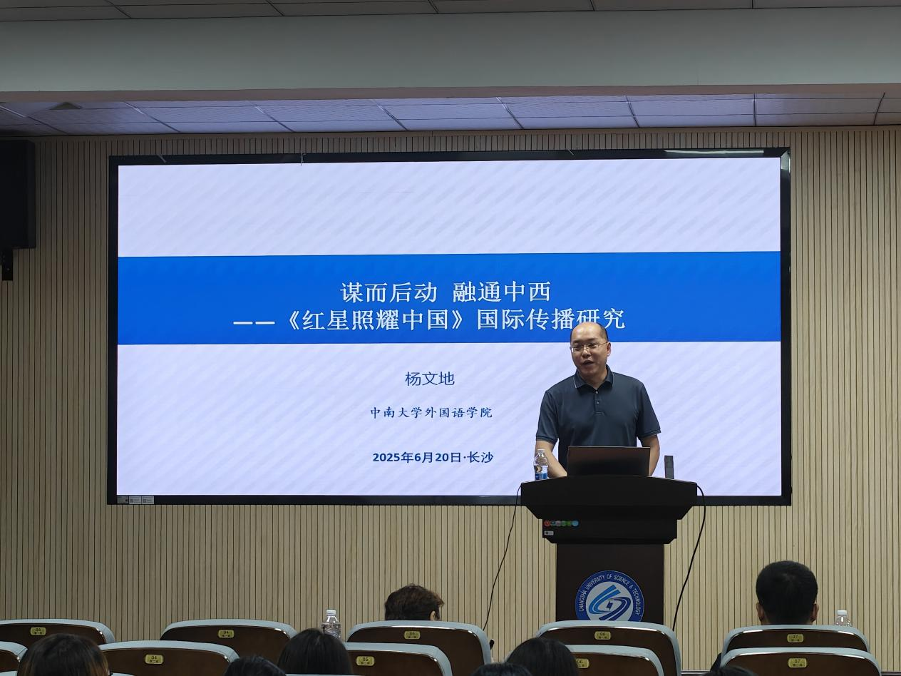 6月20日上午9点,在线买世界杯平台第二十一届研究生博力学术论坛外国语学院专题论坛学术讲座在金盆岭校区三教321报告厅顺利举行。本次讲座主题为谋而后动,融通中西——《红星照耀中国》国际传播研究,由中南大学外国语学院院长、博士生导师杨文地教授主讲,外国语学院副院长姚尧担任主持人,众多师生参会。