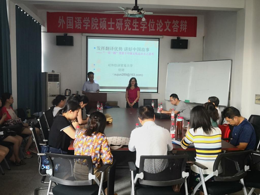 6月28日下午,对外经济贸易大学徐珺教授应邀为我院师生做了一场题为“发挥翻译优势 讲好中国故事—‘一带一路’背景下中国文化走出去之思考”的学术讲座。讲座由院长段胜峰教授主持,外国语学院科研骨干教师、部分研究生和本科生参加了此次讲座。