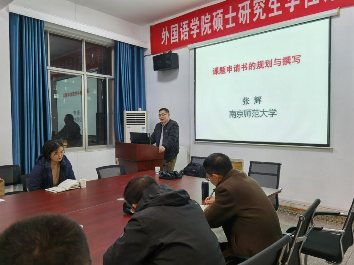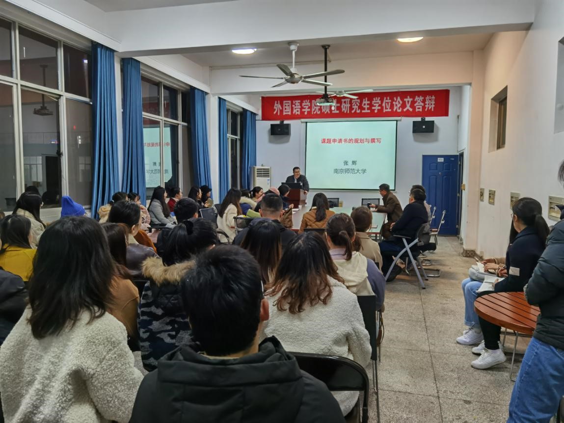 应外国语学院邀请,南京师范大学张辉教授于2020年11月25晚上19点在金盆岭9教406举行了题为“课题申请书的撰写与申报”的学术讲座。讲座由外国语学院院长段胜峰教授主持,外国语学院部分教师和研究生参加了此次讲座。