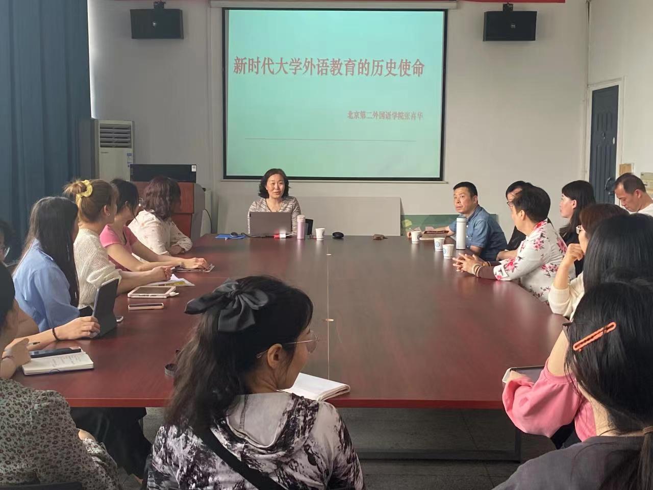 4月13日下午,北京第二外国语学院博士生导师张喜华教授应邀在金盆岭校区9教406为我院师生开展第十九届博力学术论坛讲座,主题为“新时代大学外语教育的历史使命”。讲座由外国语学院副院长黄坚教授主持,外国语学院院长段胜峰教授以及部分教师和学生参与了此次讲座。