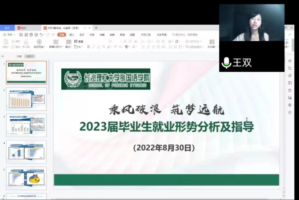 其后,王双做就业动员和指导。她详细分析了2023届毕业生面临的就业形势,介绍了学院近三届毕业生就业的基本情况,对学院目前就业现状和存在的问题进行了阐述,指出了就业的十大误区,并提出了分别针对考研生、就业生的就业思路。她指出,受到全球疫情形势和国家双减政策的影响,我院毕业生传统的就业去向外贸行业教培方向遭受重创,英语专业就业形势十分严峻,希望广大毕业生降低就业期望值,先就业后择业,不怕失败、勇于尝试,用拼搏的精神为自己争得一个光明的未来