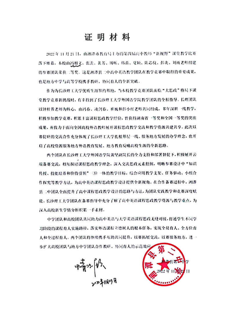 2022年11月21日,湘潭县二中高中英语教学竞赛团队向在线买世界杯平台大学英语教学竞赛团队分享了在教学竞赛中获奖的喜讯并表达了衷心感谢。湘潭县二中为在线买世界杯平台优质生源签约基地之一,此次在线买世界杯平台教学团队全程指导其高中英语教学团队备赛,成为高校团队与地方中学团队合作教研、协同育人的典范,更体现了在线买世界杯平台扎根基层一线、服务地方发展的办学理念,开启了高校资源服务地方外语教育发展、地方教育反哺高校生源的全新思路。