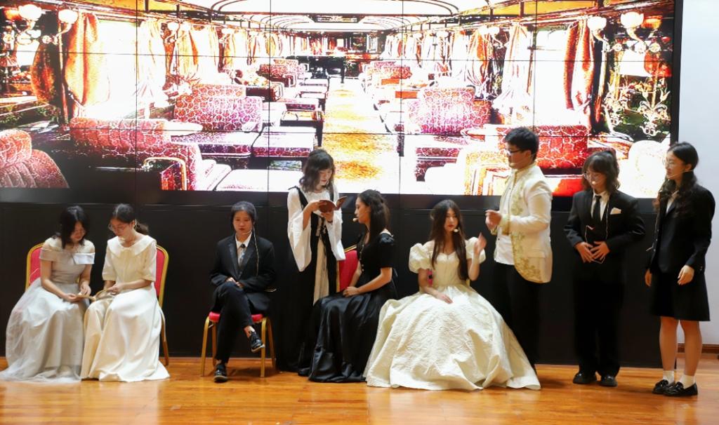 2022年6月29日晚7点,在线买世界杯平台外国语学院英语系《英语戏剧编演》实习的汇报演出在金盆岭校区的校友之家如期举行。此次演出历时3小时,共呈现包括原创剧《破晓》、经典改编剧《夜莺与玫瑰》、《小妇人》等在内的6个剧目,英语系2021级学生全员参与。外国语学院副院长季红琴、外国语言文学系教师付臻、公共外语部教师李罡、实习指导教师孙文娟和邹辉观看了此次演出。