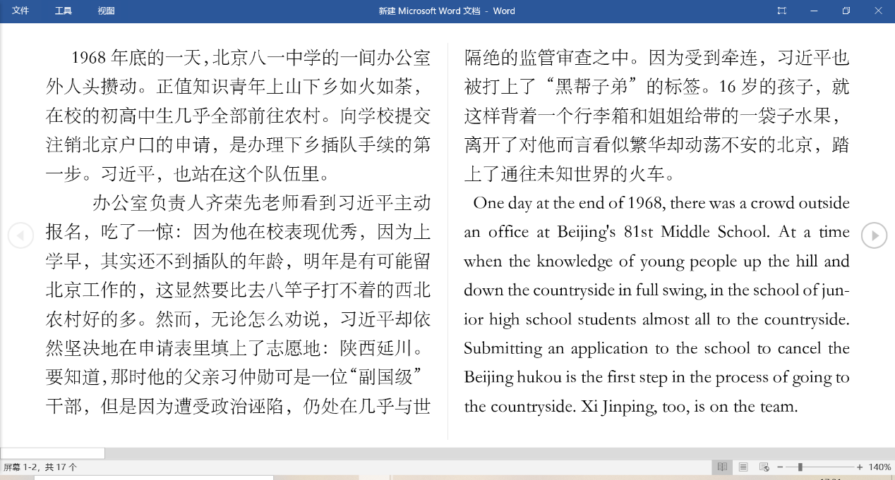 2021年8月12日,来自在线买世界杯平台外国语学院的薛丽同学,查阅背景资料,借阅翻译辅助资料,对《习近平的七年知青岁月》节选进行了翻译。《习近平的七年知青岁月》是由中共中央党校出版社编著的采访实录。在之前读过这本书的基础上,有了对这本书基本的了解,思想的感悟,所以这也使得她的翻译的过程中顺畅了一些。当然,其中也免不了一些困难,因为文中有对当地人的采访,所以他们的话带一些地方特色。但是她没有因此退缩,而是利用网络搜集资料,使得译文更加的流畅自然地道。