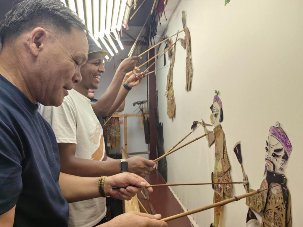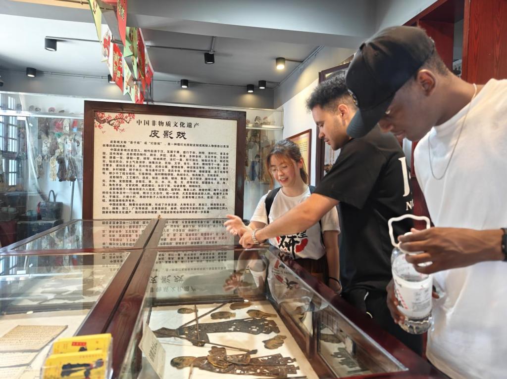 接着,实践团带领外国友人来到皮影戏馆,邀请祖传皮影艺术传承人朱国强先生为大家表演了孙悟空大战蜈蚣精一戏。外国友人聚精会神地观赏表演,实践团也为他们提供了详细的解说,让外国友人能更好地感受到这场演出的精彩绝伦。表演过后,朱国强请外国友人进入幕后亲自感受皮影戏的魅力,实践团也继续实时跟进翻译。一位外国友人表示:“皮影戏确实有趣,但实际操作起来并不容易。”朱国强也自豪地提到:“我之前已经受邀去了48个国家进行演出,他们都对我的表演和中国文化赞不绝口,我希望可以将皮影文化传播到世界更多的国家去,让全世界都能领略我们中华非遗物质文化的巨大魅力。”