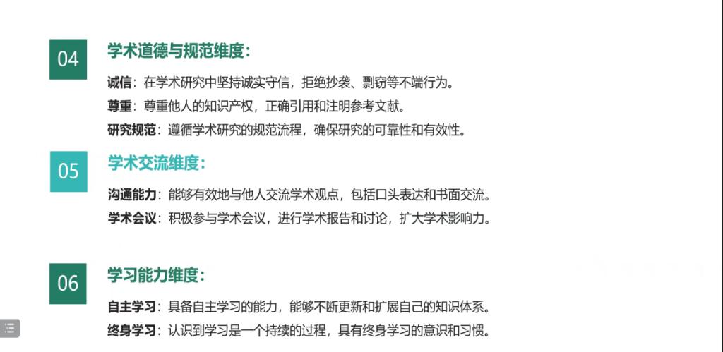 张志武重点介绍了学术素养与科研能力、专业知识与技能提升、实践能力与创新能力、综合素质与人际关系这4个部分。在学术素养与科研能力这部分,张志武首先介绍了学硕和专硕在课程设置和科研训练上的区别,然后从知识、研究能力、学术写作、学术道理与规范、学术交流、学习能力这6个维度展开,详细阐述了同学们在研究生期间需要培养的学术素养以及需要提升的科研能力;并分享了自己在从事科研时所研读过的不同专业和领域的书籍,包括但不限于学术研究方法等方面的书籍,激发了同学们的阅读热情。在专业知识与技能提升这部分,张志武鼓励同学们积极参加各类学科竞赛并努力考取专业证书,提升自身的专业技能和就业竞争力。在实践能力与创新能力这部分,他鼓励同学们积极申报科研或实践创新项目,并结合自己的经历,号召大家踊跃参加各类学术会议与讲座,以此来丰富学识、开阔视野。在综合素质与人际关系这方面,张志武从团队协作与沟通能力、时间管理与自律能力、心理素质与抗压能力、以及人际交往与职业素养这4个方面,向同学们分析了科研的成功是多个因素所共同造就的结果,旨在激励同学们去提升自身的综合素养。