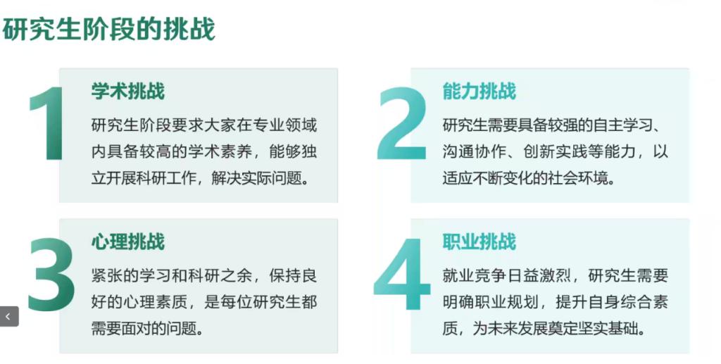 讲座伊始,张志武以自己在读博期间做科研的经历为切入点,向24级新生们阐述了自己的心路历程,以此来激发同学们做科研的热情,紧接着分析了研究生阶段所要面临的学术、能力、心理、和职责这四大挑战,旨在让同学们尽早为自己的研究生生涯做好充分的准备。