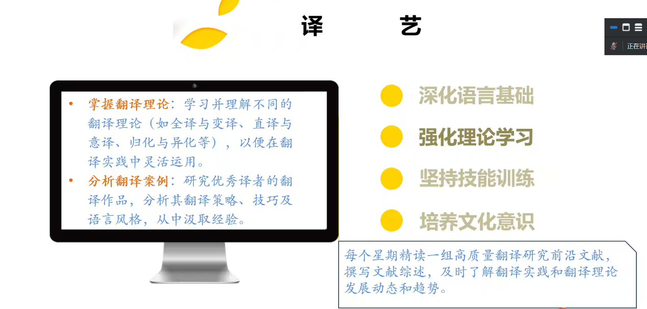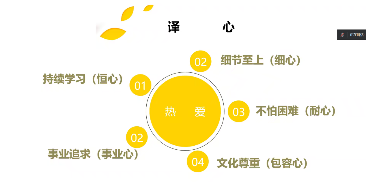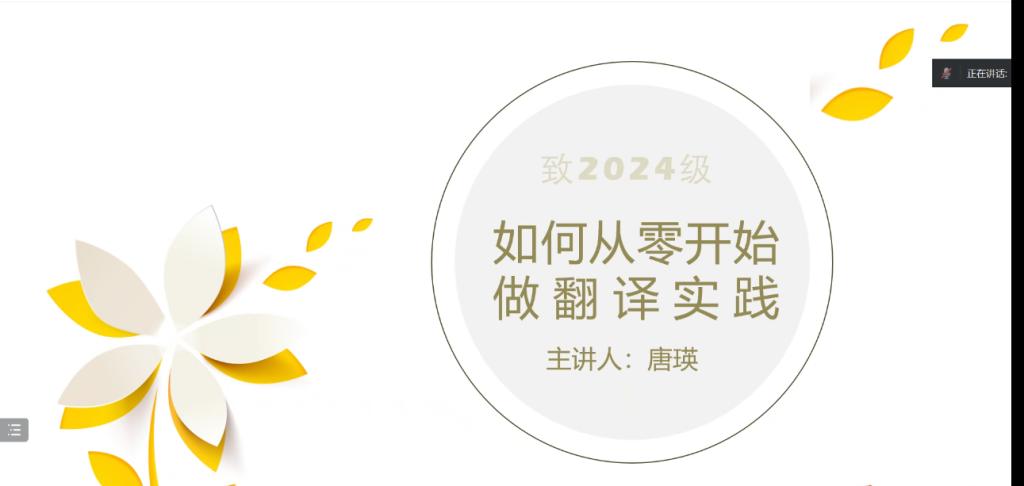202495日上午,外国语学院特邀唐瑛老师为24级硕士研究生新生开展了主题为“从零开始做翻译实践”的线上专题讲座,旨在为新生们提供一个清晰的翻译实践入门指南,引导他们认识翻译实践的重要性,并为他们今后的学术研究和职业发展打下坚实的基础。