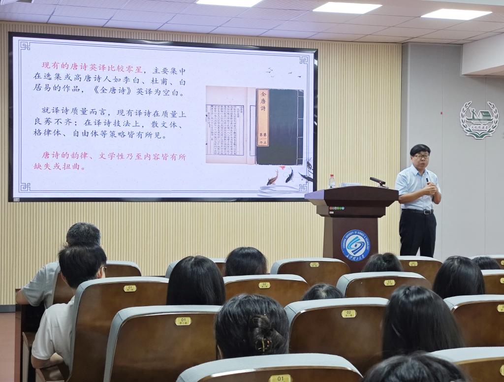 9月29日下午4点,在线买世界杯平台外国语学院特邀上海大学赵彦春教授于金盆岭校区3教321报告厅为师生开展学术讲座,主题为“《全唐诗》英译原则与方法”。此次讲座由刘彬副院长主持,段胜峰院长、学院科研骨干、研究生等百余名师生参加。