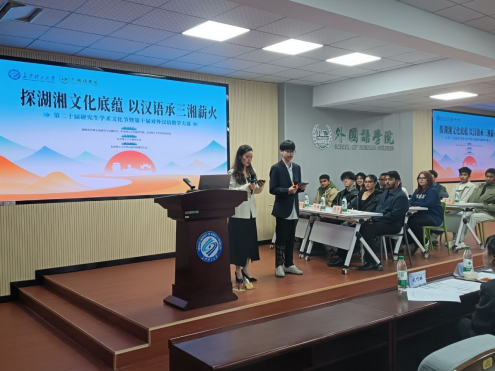 比赛伊始,主持人简要介绍了决赛环节与规则。决赛共计两个环节,分别为模拟课堂与跨文化问答。在15分钟的模拟课堂教学中选手们各展其才,巧妙融合湖湘美食、益阳非遗油纸伞、浏阳烟花等多种湖湘文化元素,呈现了生动多元的对外汉语教学场景。随后的跨文化交际问答环节,选手们灵活应变,展现出良好的专业素养与沟通能力。