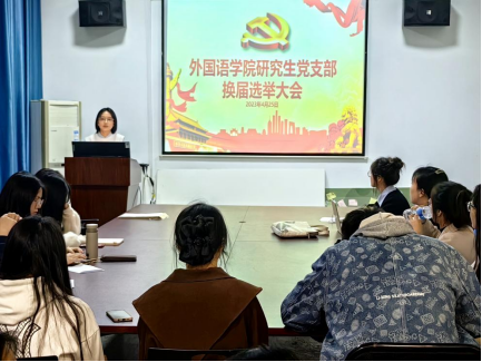 4月25日晚七点,外国语学院研究生第一、二党支部于九教406共同开展4月份“学思想、强党性、重实践、建新功”主题党日活动暨支委换届选举大会。本次活动由第一党支部副书记陈熠同志主持,党建辅导员毛婕老师及全体党员同志参加。
