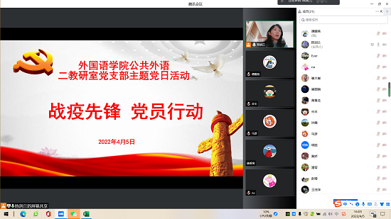 4月5日至4月7日,学院四个教工党支部分别通过“腾讯会议”平台开展“战疫先锋,党员行动”主题党日活动。活动由各支部书记主持并讲话,教工全体党员参加会议。