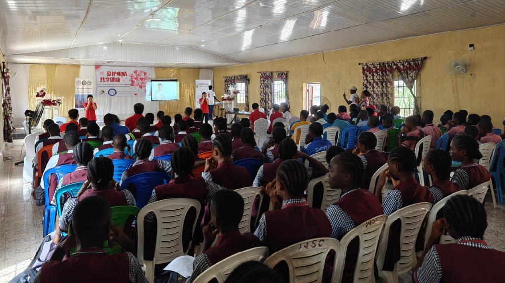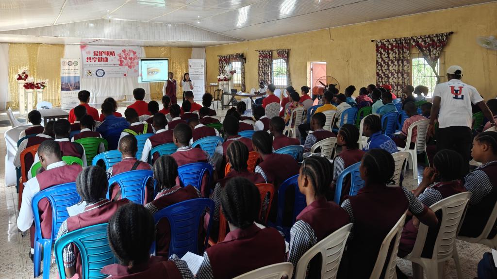接着,援利医疗队翻译余丽莉老师与袁婧玮医生为师生们带来了专业的中医护眼讲座及动作演示。于老师详细讲解了中国特色传统医学爱眼护眼健康知识和护眼方法;袁医生则向师生们展示了眼保健操的正确做法。师生们听得津津有味,纷纷表示要将这些中医护眼知识应用到日常生活中,医疗队还为师生们发放了眼科常用药品。