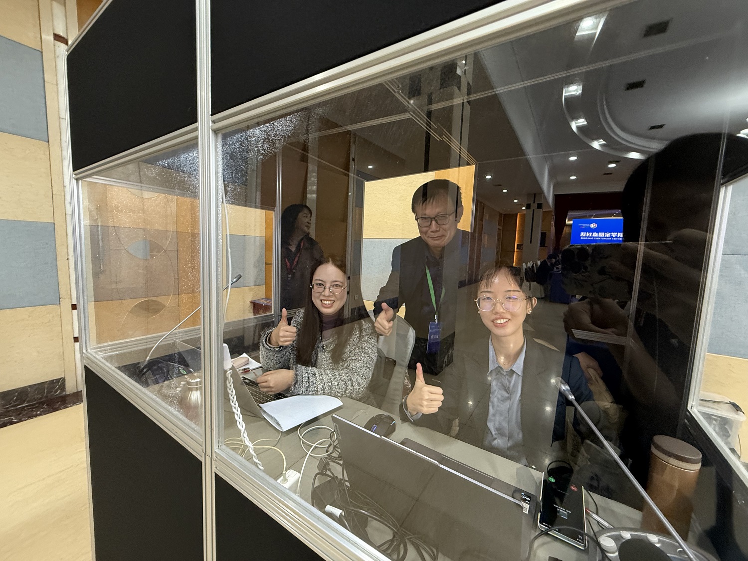 图四:我会副秘书长何健与同声传译译员马泳斐、谭鹂雯