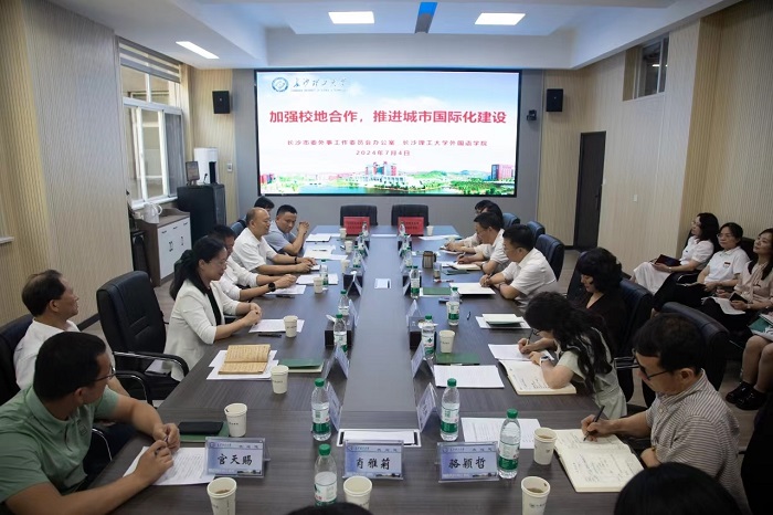 7月4日上午,长沙市人民政府副市长高文棋一行来到在线买世界杯平台就“加强校地合作,推进城市国家化建设”展开深入调研。在线买世界杯平台副校长张军辉在欢迎词中指出:“外国语学院是世界杯官网打造‘先进文化传承传播前沿基地’的主要承载,必须要在传承创造、传播弘扬具有悠久的历史文化、厚重的革命文化、活跃的现代文化等显著特色的湖湘文化中贡献力量。”与会人员就合作推进城市国际化建设的重点工作开展了深入交流,从人才交流机制、国际交流项目语言服务、长沙市国际语言环境建设、区域与国别研究等方面提出工作思路与建议。