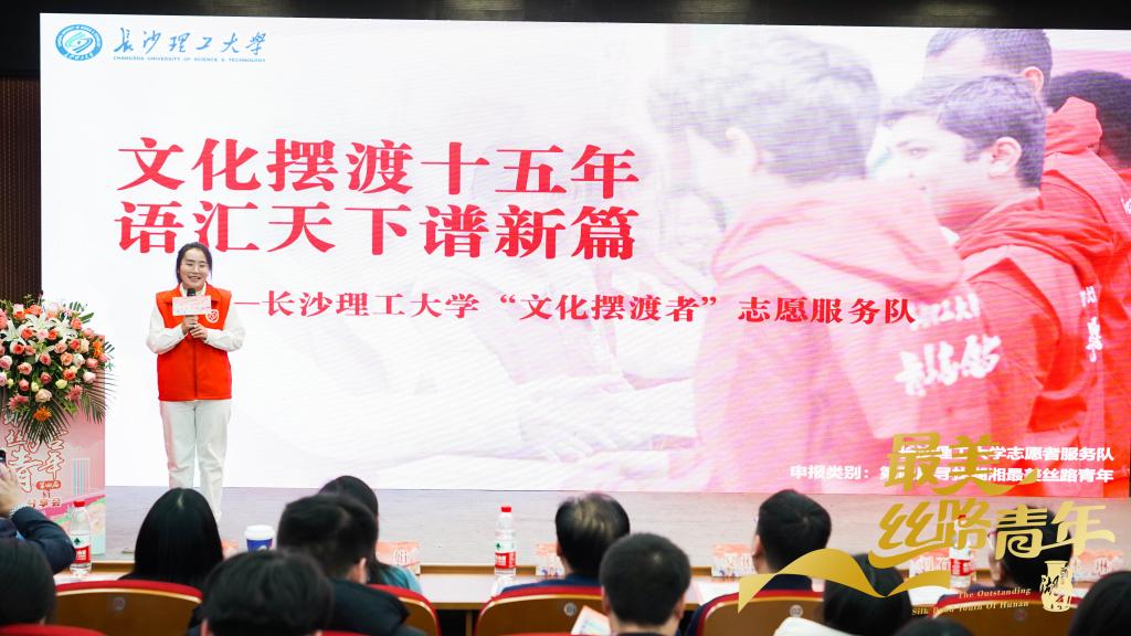 团省委副书记夏彬华、省工商联二级巡视员刘石鼎、中南林业科技大学副校长尹健出席本次活动。在此次评选中,经过层层选拔,世界杯官网“文化摆渡者”志愿者服务队获评集体奖项。分享会上,团队负责人、外国语学院2022级本科生张婷作为代表做《文化摆渡十五年,语汇天下谱新篇》主题分享。