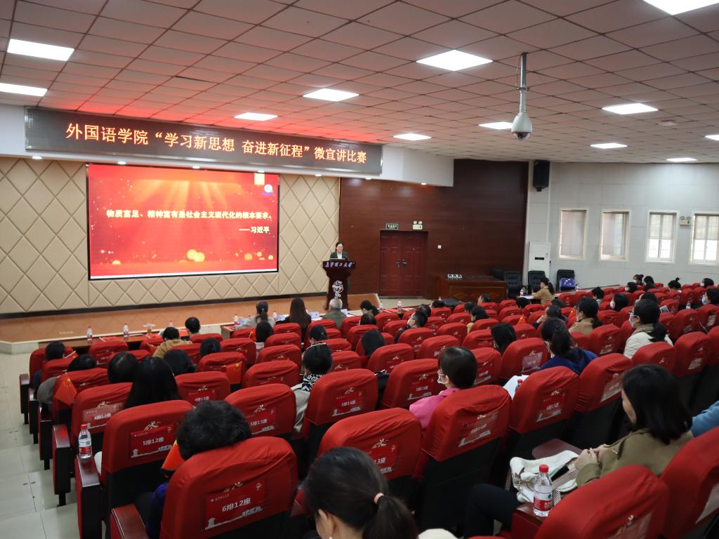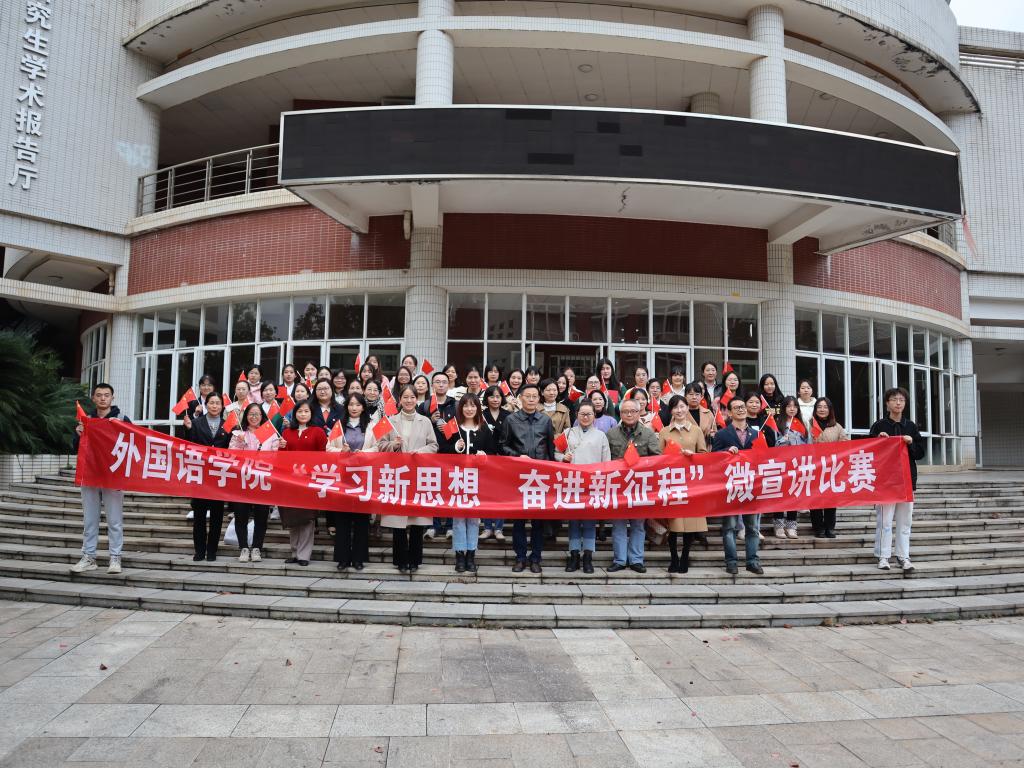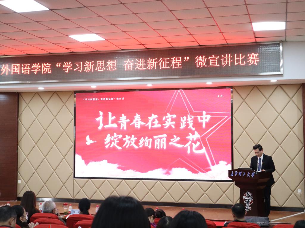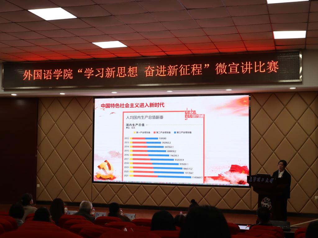 11月15日14:30,在线买世界杯平台外国语学院在云塘校区文科楼A-200学术报告厅举办了“学习新思想,奋进新征程”主题微宣讲比赛。校工会常务副主席郭剑、党政办副主任喻玲、教务处副处长邓丰、党建组织员邓豫出席活动并担任评委,外国语学院全体师生党员热情参与。