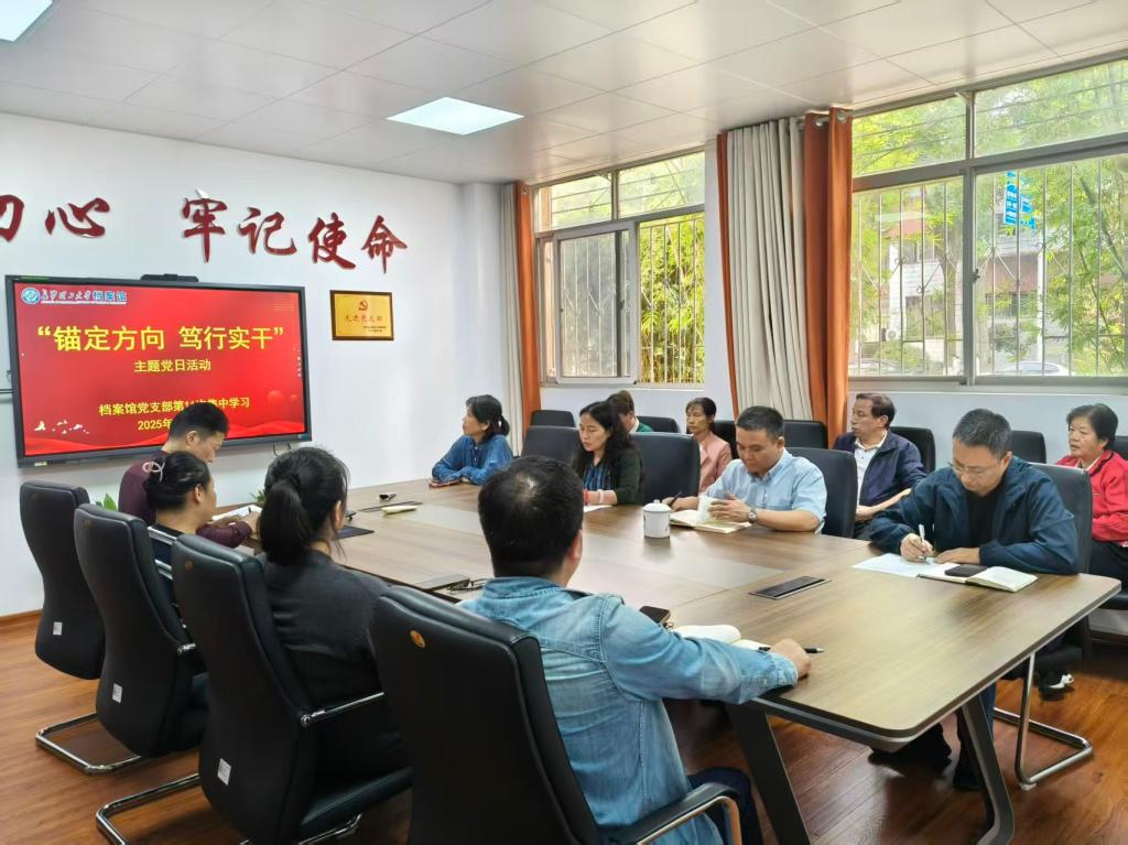 10月15日,档案馆党支部组织开展了“锚定方向 笃行实干”主题党日活动,会议由支部副书记王任飞主持,档案馆全体教职工参加。