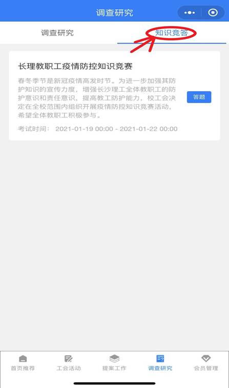 第三步:点击下方菜单栏中“调查研究”按钮,再次点击“知识竞答”按钮