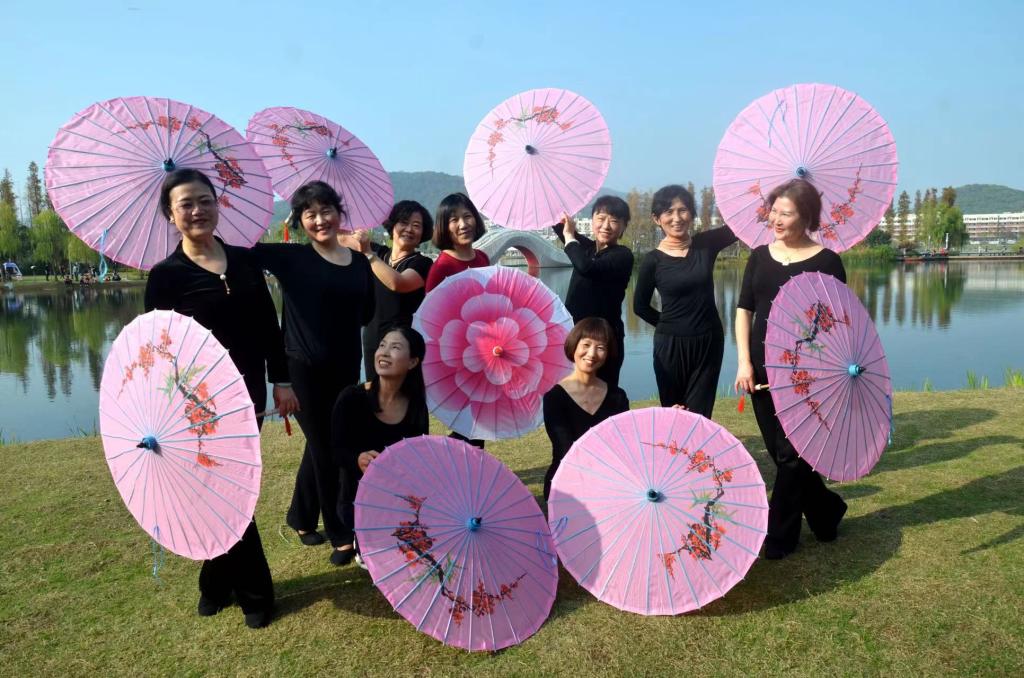 当日,天气晴好,没有冬天萧条的迹象。行人道旁高出半人高的芦苇叶未尽枯黄,竭尽全力与季节抗争,稀疏地摇曳着绿色。太阳宛如深秋的和煦,照得身上脸上暖烘烘的。会员们相聚于后湖湖畔,与初冬共景。在蓝天、白云、湖边灰绿垂柳和金黄松柏、湖心白色拱桥及湖面倒影相互交织的如油画般为背景的天然舞台上,携冬阳翩翩起舞,快乐在心中荡漾,享受祖国强大带来的平安幸福。从五指山下孕育了红色娘子军的《万泉河水》到神奇仙境人间天堂《我的九寨》,从天山上甘甜的《一杯美酒》到对祖国无限依恋和自豪的《我和我的祖国》……从百年前风雨飘摇的中国到如今华夏繁荣昌盛、人民安居乐业,从站起来、富起来到强起来,无不展现了一幅共产党人“为人民谋幸福”的初心、为实现中华民族伟大复兴的中国梦永续奋斗的壮丽画卷。