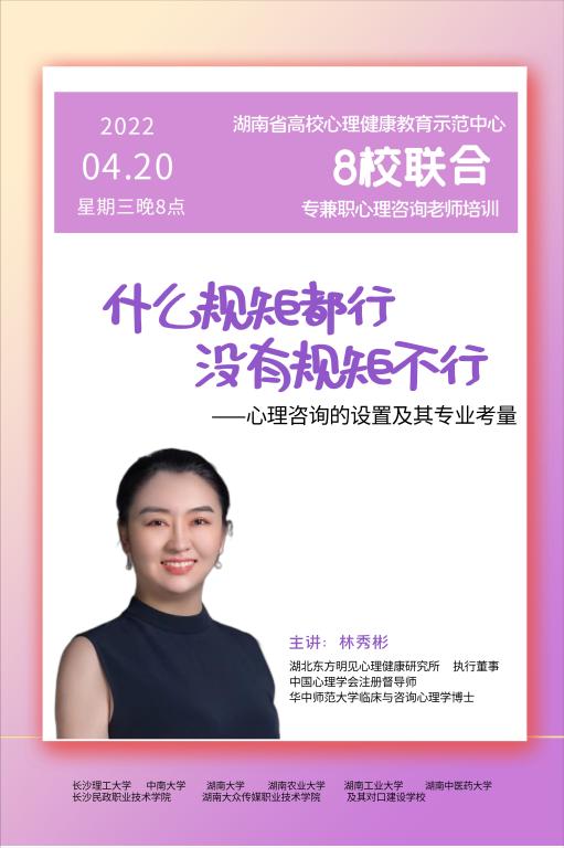 2022年4月20日晚,我院与在线买世界杯平台、中南大学等八所湖南省高校心理健康教育示范中心及对口协作学校联合开展专兼职心理咨询老师培训。本次培训主题为“什么规矩都行,没有规矩不行——心理咨询的设置及其专业考量”,活动邀请美国雷德兰兹大学特聘教授、华中师范大学临床与咨询心理学博士、中国心理学会注册系统心理师林秀彬老师主讲,湖南省心理健康教育研究会秘书长、在线买世界杯平台心理健康教育中心主任龚勋副教授主持会议,近260名专兼职心理咨询师聆听了讲座。