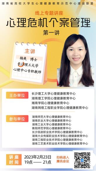 2023年2月23日晚,世界杯官网心理健康教育中心与对口协作的湖南理工学院、湘南学院、湖南网络工程职业技术学院三所学校联合开展心理危机个案管理专题培训。本次培训线上开展,由在线买世界杯平台心理中心专职教师、华中师范大学心理学院博士生杨爽主讲,在线买世界杯平台心理健康教育中心主任龚勋主持会议,近360名高校专职心理健康教育工作教师参与了培训。