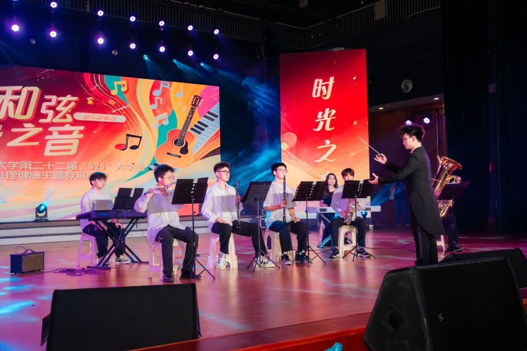 活动在阳光艺术团悠扬的管乐五重奏中拉开序幕,钢琴与管乐交织的旋律点亮全场。围绕亲情、友情、爱情与成长四大主题,学生们通过歌声与故事分享真实情感:暮云等同学演绎的《父亲写的散文诗》道尽父爱深沉,贾正豪的《奶奶》唤醒隔辈温情;俞昊成原创歌曲《格桑花落》以空灵旋律诠释友情治愈力,黎芷的《这条小鱼在乎》则讲述自我蜕变的勇气。现场还表彰了六支“朋辈心理互助优秀集体”,致敬校园中默默守护心灵的同伴力量。