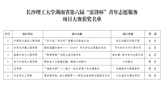 世界杯官网共6个项目团队入围终审决赛,最终获得“三金两银一铜”的好成绩。其中,计通学院“双干线 网空间”智慧社区帮扶行动、水利学院绿色韶灌沃湘中——‘1+3+4’节水护水志愿服务项目和能动学院“降碳青锋”双碳公益实践项目荣获金奖,电气学院“聚焦电力大数据挖掘,赋能乡村振兴”项目和法学院“湘扶守望”——城乡一体化涉罪少年法律服务项目荣获银奖,马克思主义学院青述新思想,助力强国梦—研究生宣讲团志愿服务项目荣获铜奖。