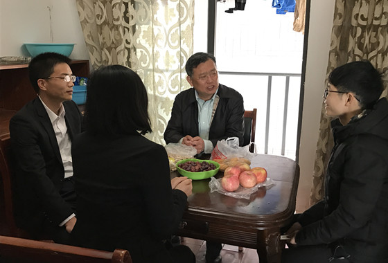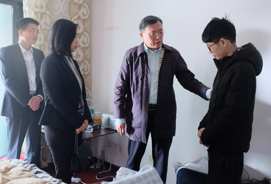 4月8日上午,副校长谈传生在校团委书记陈曦、计通学院党委书记方琼等一行人的陪同下看望了租住在长沙市四方坪的患病学生邹勇松。