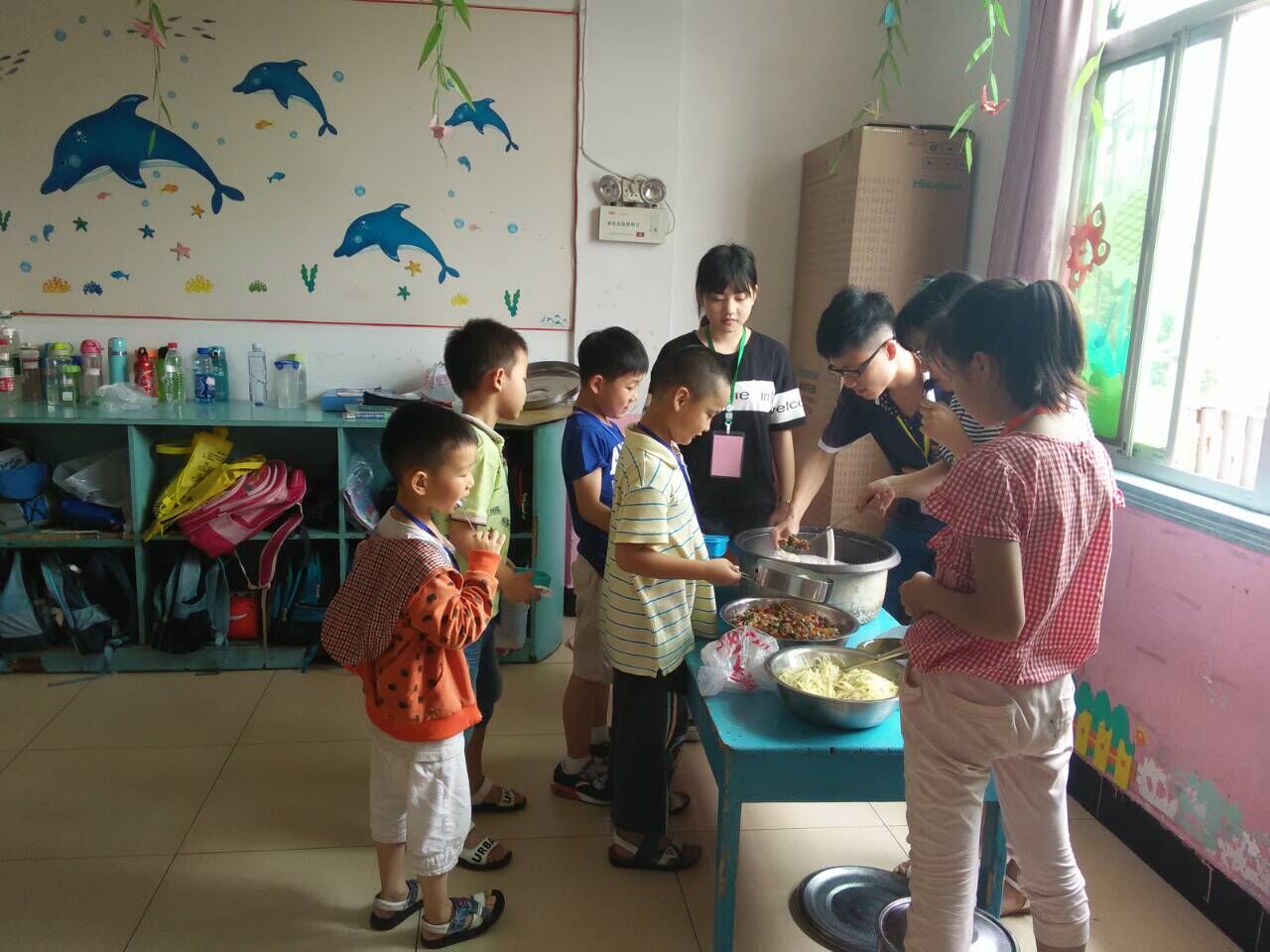 在中午吃午餐环节,志愿者们积极地为孩子们盛饭盛菜,小家伙们表现的很有礼貌,依次排队领取了饭菜,特别是饭菜很快就被吃了个精光。