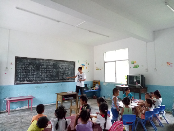 白色粉笔在黑板上述说着下寨小分队志愿者的青春,传递给下寨小朋友们美好的童年,志愿者赵静晶说:“今天是‘开学’的第一课,对我们的支教老师来说这也是他们人生的第一课,大家能够在一起学习,共同进步,是我们共同的福气。窗外的知了一样用自己全部的生命在这炎炎夏日里歌唱着,我们支教团队的成员们也在这里歇斯底里的书写着青春的印记,而与每一位小朋友在一起的日子都将是我们这一段时光中最美好的回忆。”