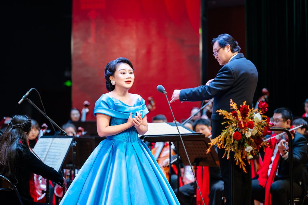 音乐会的曲目编排兼具经典底蕴与艺术新意,十二首曲目涵盖交响乐、声乐独唱、民歌改编等多种形式。《节日序曲》率先奏响,肖斯塔科维奇的经典旋律以恢弘的气势拉开演出帷幕;《春之声圆舞曲》《蓝色多瑙河》《雷电波尔卡》等小约翰·施特劳斯的代表作接踵而至,明快的节奏与优美的旋律勾勒出春日的生机与节日的欢腾,让现场观众沉浸式感受维也纳圆舞曲的独特魅力。西洋经典声乐作品的演绎同样亮眼,黎明的嗓音高亢嘹亮,将《我的太阳》这首经典那不勒斯民歌的情感表达得淋漓尽致;《歌剧魅影组曲》重现音乐剧的经典旋律,氛围感拉满;男声独唱《斗牛士之歌》,则将歌剧《卡门》中的豪迈气概展现得酣畅淋漓。民族与时代之声也在音乐会中绽放光彩,改编自江苏民歌的《茉莉花》婉转悠扬,尽显东方音乐的温婉之美;戴韩安妮带来女声独唱组曲,《但愿人长久》《Hero》《凤凰花开的路口》三首曲目使古典诗词的意境、英文金曲的力量与校园情怀的温暖交织,引发观众情感共鸣。此外,《百叶窗》的轻柔旋律、《我爱你中国》中炽热的家国情怀、压轴曲目《领航》里昂扬的时代精神,都将现场氛围一次次推向高潮。