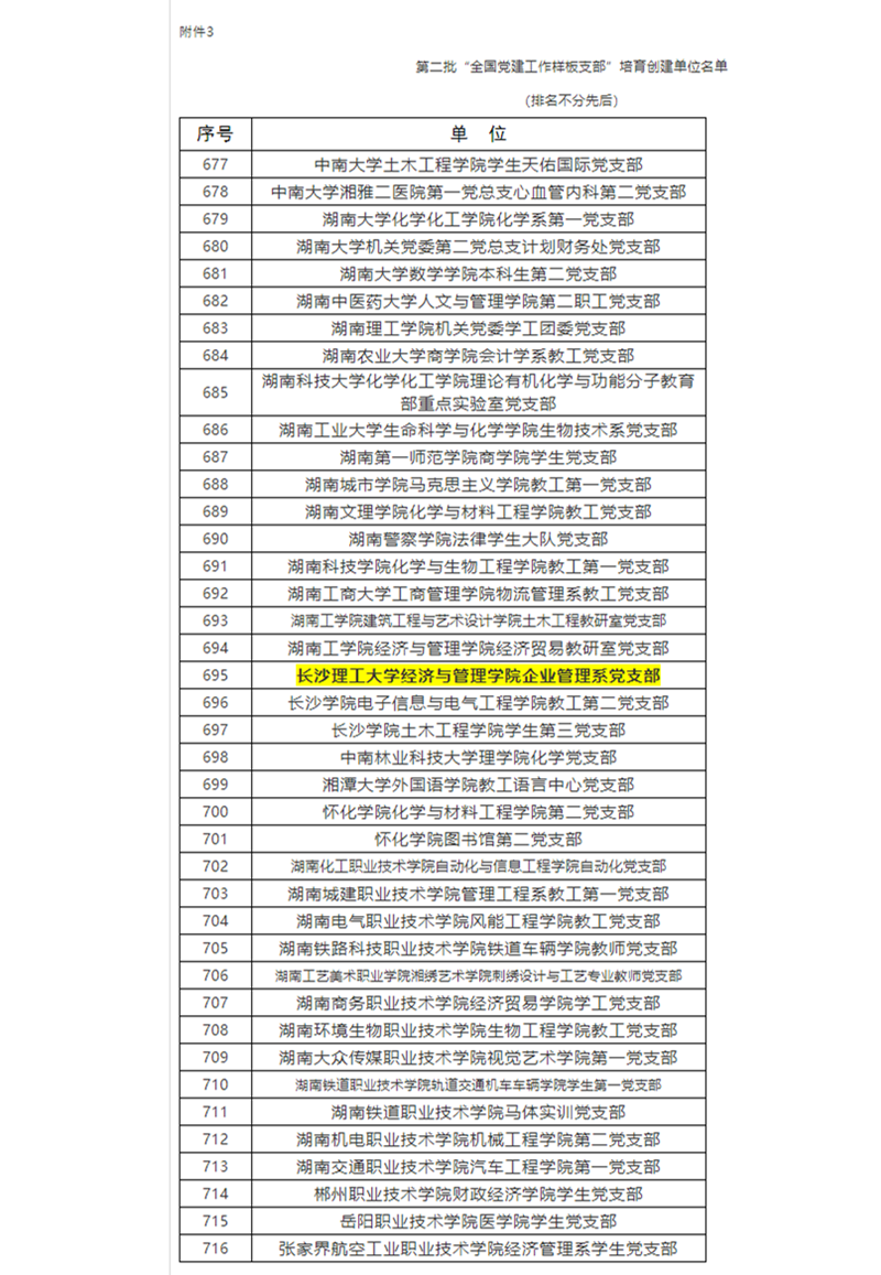 根据《教育部办公厅关于开展第二批新时代高校党建示范创建和质量创优工作的通知》(教思政厅函〔2019〕15号,以下简称《第二批双创工作通知》)安排和评审工作方案,经资格审查、专家推荐、教育部党的建设和全面从严治党工作领导小组成员单位集中审议、结果公示,遴选产生10个高校党委、99个院系党组织、999个党支部分别作为全国党建工作示范高校、标杆院系、样板支部培育创建单位。其中,湖南省高校共有26个党支部获得样板支部培育创建单位,经管学院企业管理系党支部是世界杯官网唯一获此殊荣的党支部。