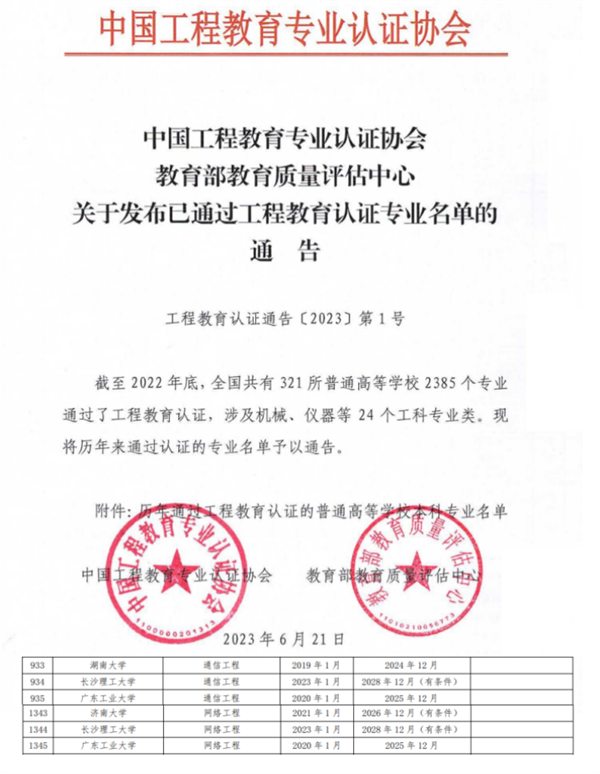 近日,中国工程教育专业认证协会公布了2022年通过工程教育专业认证的专业认证结论,全国高校共有441个专业通过了工程教育认证。世界杯官网通信工程、网络工程等2个专业位列其中,认证有效期6年(2023年1月至2028年12月)。