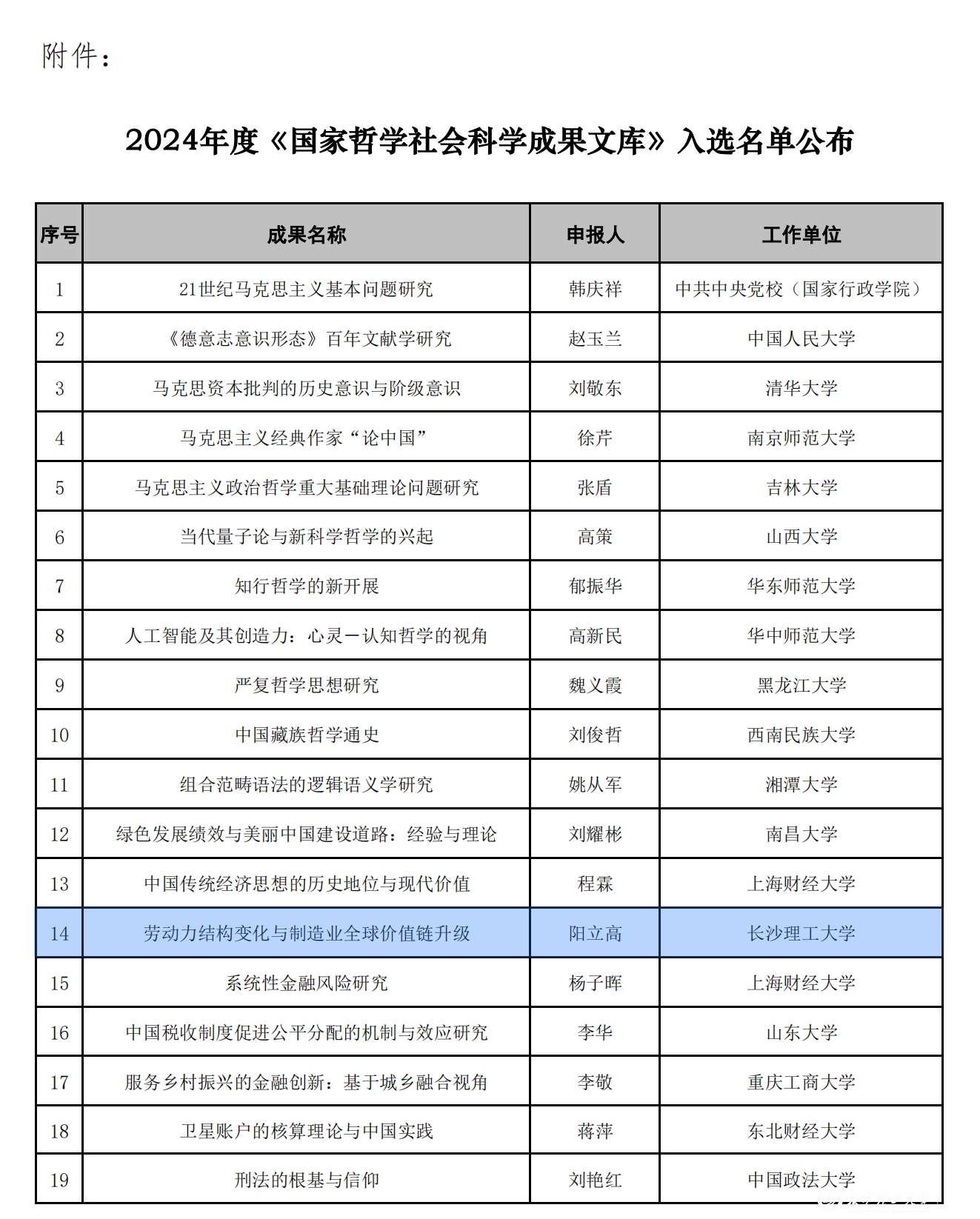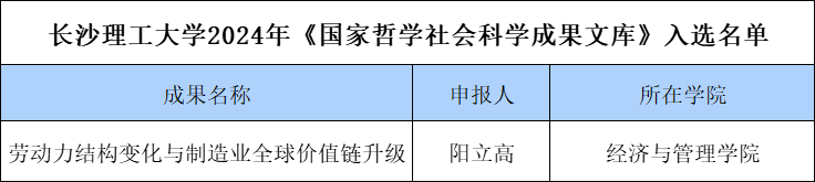 近日,全国哲学社会科学工作办公室公布了2024年度《国家哲学社会科学成果文库》入选名单,世界杯官网阳立高教授的成果《劳动力结构变化与制造业全球价值链升级》入选。