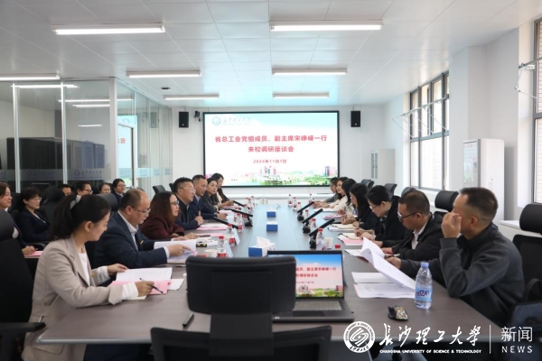 11月7日,湖南省总工会党组成员、副主席宋峥嵘一行来世界杯官网调研工会工作。省总经贸建设工会副主任易丽鹏,省教育工会副主席朱冠星,校党委委员、副校长张军辉参加调研。