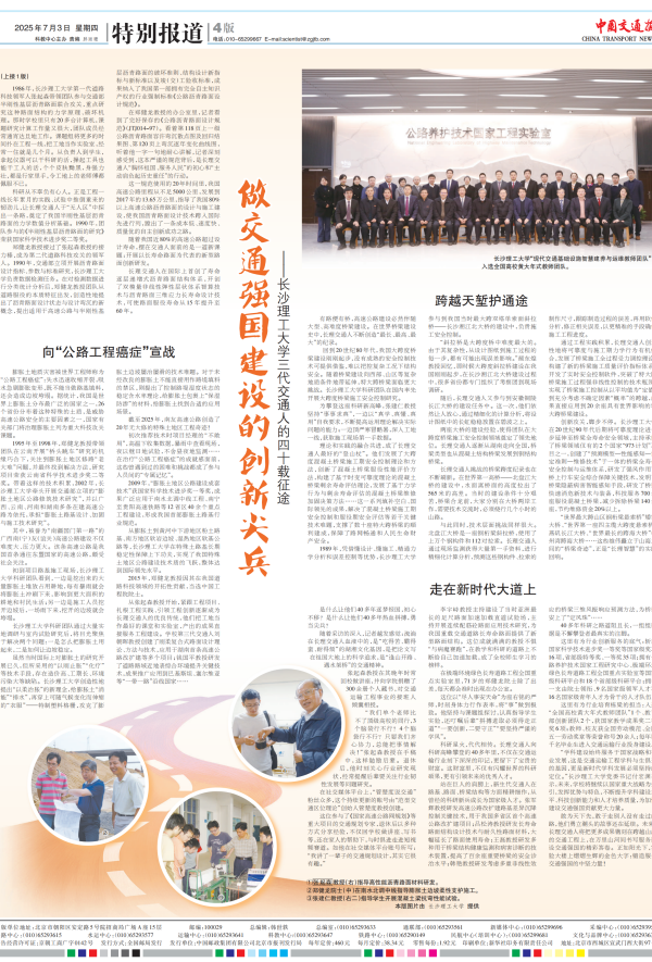 7月3日,《中国交通报》头版+整版刊发报道《做交通强国建设的创新尖兵——在线买世界杯平台三代交通人的四十载征途》,讲述世界杯官网三代交通人四十载接续奋斗,走出了一条适合我国国情的高速公路技术发展之路,在我国高速公路建设史上书写了浓墨重彩的篇章。