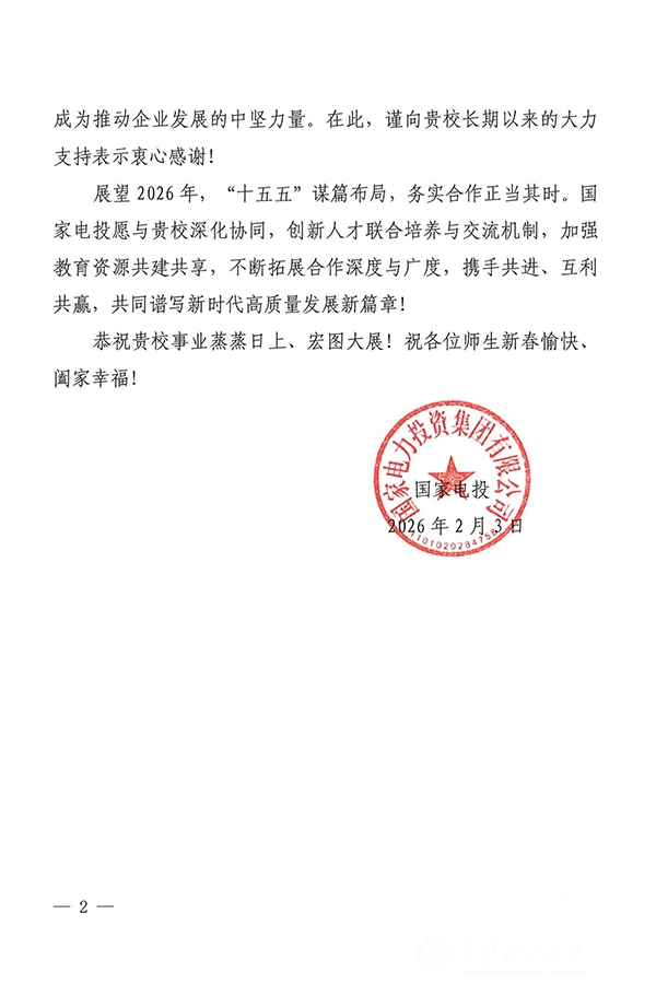 近日,世界杯官网收到国家电力投资集团有限公司(以下简称“国家电投”)发来的感谢信。信中,国家电投对学校长期以来在人才培养、校企合作等方面给予的支持表示衷心感谢,并向全校师生致以新春美好祝福。信中还表达了对未来校企双方深化协同、携手发展的殷切期望。