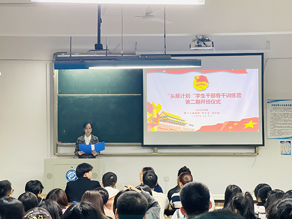 11月5日,设计学院第二期“头雁计划”学生干部骨干训练营开班仪式分别在云塘校区、金盆岭校区举行。文新学院研究生李楚帆同学,校团委学生会主席高海同学,设计学院第十二届团委学生会执行主席张跃宗同学、李世成同学,数媒1903班团支书刘晓茹担任此次课程主讲人,第十三届团委学生会主席团及各年级学生干部参加。