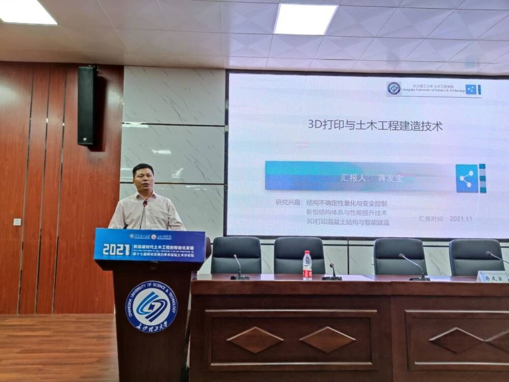 报告会上,蒋友宝围绕“土木工程专业与3D打印发展背景介绍、3D打印混凝土技术简介及土木工程应用、3D打印混凝土结构建造的关键技术、基于3D打印的土木工程建造技术展望和技术团队初步研究工作”五个方面的内容,与学生们共同探讨了3D打印建造技术相较于传统的建造技术的优势,3D打印混凝土技术的发展和应用前景。他详细介绍个人研究团队关于3D打印混凝土建造技术的研究工作,并展示团队在此领域所取得的研究成果,最后,蒋友宝寄语青年学子要有梦想,要心怀诗和远方,既要扎实掌握现有的成熟建造技术,也要聚焦前沿、勇于创新。
