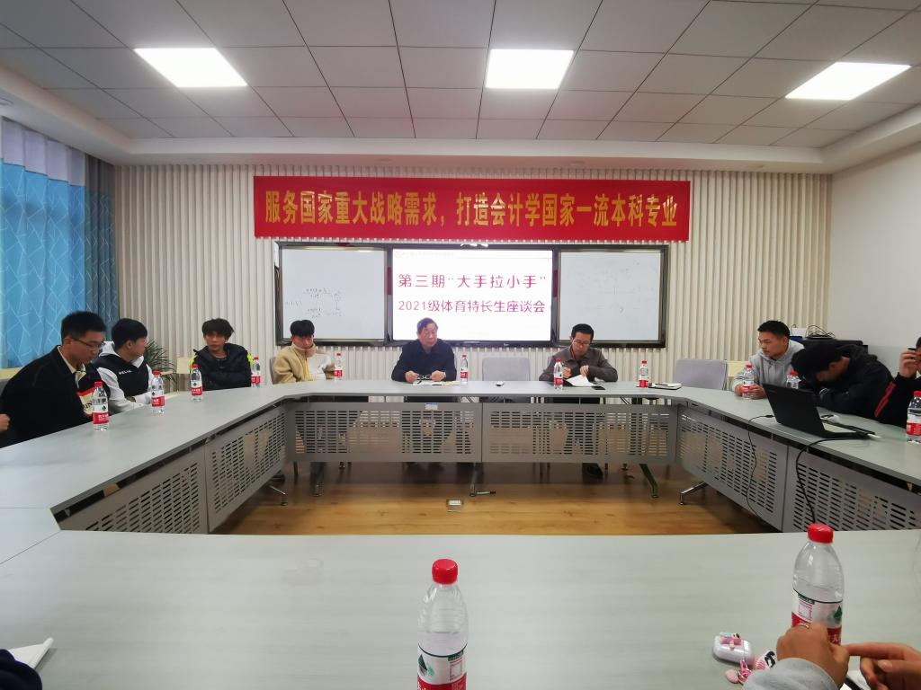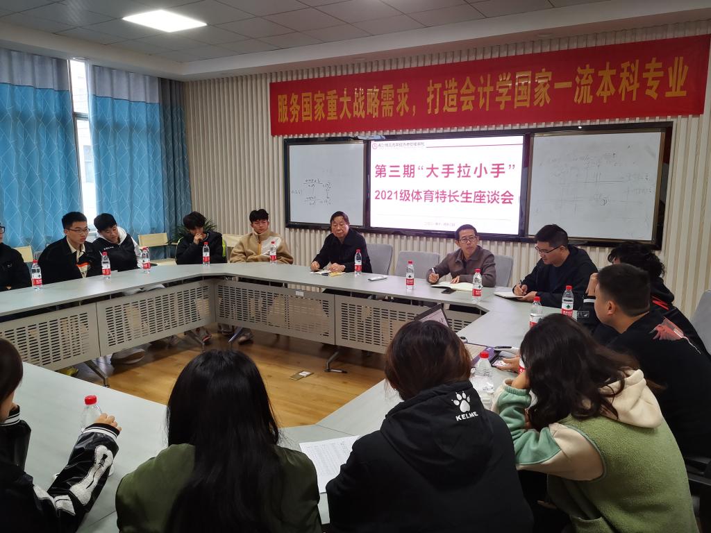 为进一步了解体育特长生的思想学习生活动态,帮助体育特长生解决实际问题,11月12日上午,经管学院在金盆岭校区七教206召开第三期“大手拉小手”师生交流会暨体育特长生座谈会。院关工委常务副主任陈均杰、院专职组织员丁力、21辅导员王宝宝、21级体育特长生参加此次会议。