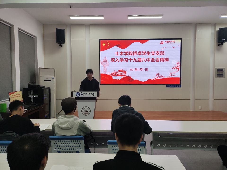 11月17日晚,土木学院桥卓专业学生党支部在工科二号楼A304组织专题学习,深入学习党的十九届六中全会精神,并部署支部党员学习宣传贯彻工作。会议由党支部书记龙承运主持,支部全体党员、重点发展对象和各班学生代表参加。